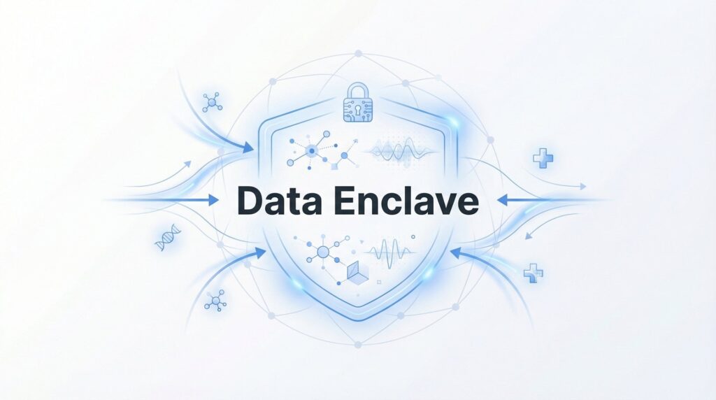 An enclave analyzes data where it lives. The genomic data stays in the genomics system. Clinical records remain in the EHR. Real-world evidence stays with the data provider. The enclave creates a secure workspace where authorized tools can access these sources without creating copies.