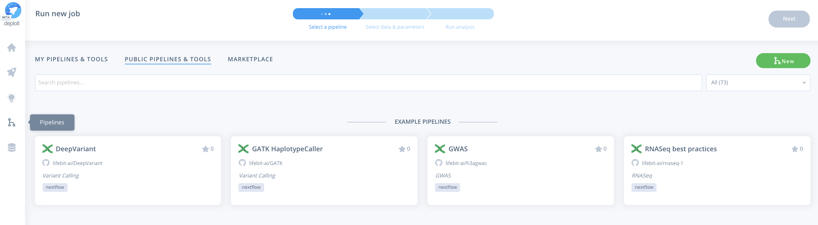 Before starting, make sure you have already created your free CloudOS account. You can then navigate to the pipelines page on CloudOS: