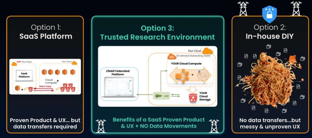TREs are the only model that simultaneously deliver sovereign control, usable data, and fast results—without transferring risk to vendors or internal teams. They represent a third architectural mode to SaaS and DIY platforms, since they combine the data residency and control of a DIY approach with the self-service capabilities and proven user experience of a good SaaS solution.