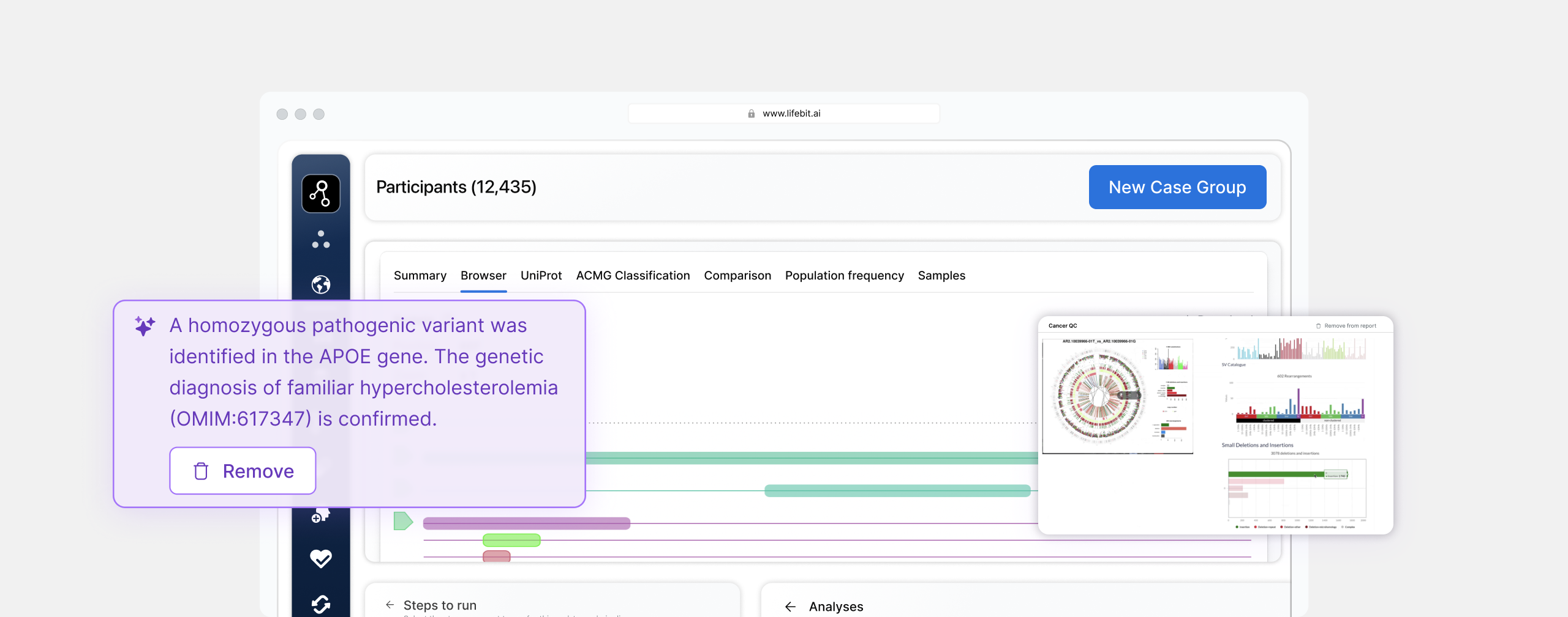 Lifebit’s Clinical Trials Platform enables sponsors, CROs, and research sites to connect, manage, and analyze trial data in place—accelerating insights without compromising compliance.